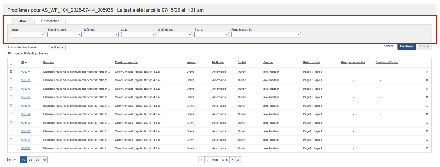 Filtrage des problèmes