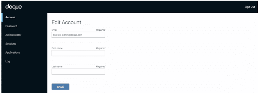 - Email: Obligatoire et modifiable. Bien que ce champ soit modifiable, l'adresse e-mail ne doit pas être mise à jour à partir de cet écran. Pour modifier votre adresse e-mail, veuillez contacter le service d'assistance de Deque.