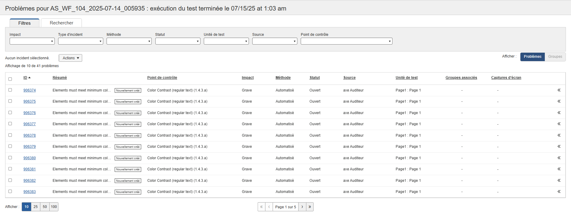 L'écran des problèmes pour <Test Case Name> affiche un tableau d'informations sur les problèmes pour le cas de test sélectionné avec des filtres qui vous permettent d'affiner les problèmes affichés selon divers critères. De plus, cet écran vous offre la possibilité de filtrer et d’exporter les problèmes.