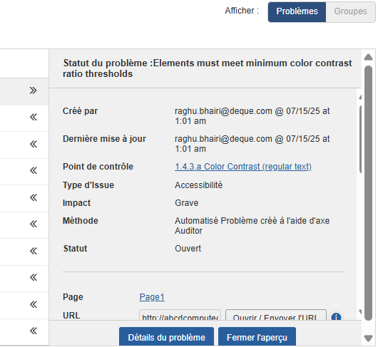 - Minor: Ceci est considéré comme un problème qui a moins d’impact pour les utilisateurs qu’un problème modéré. Pour qu’une page soit considérée comme entièrement conforme, ce problème doit être résolu, mais peut être traité en dernier.