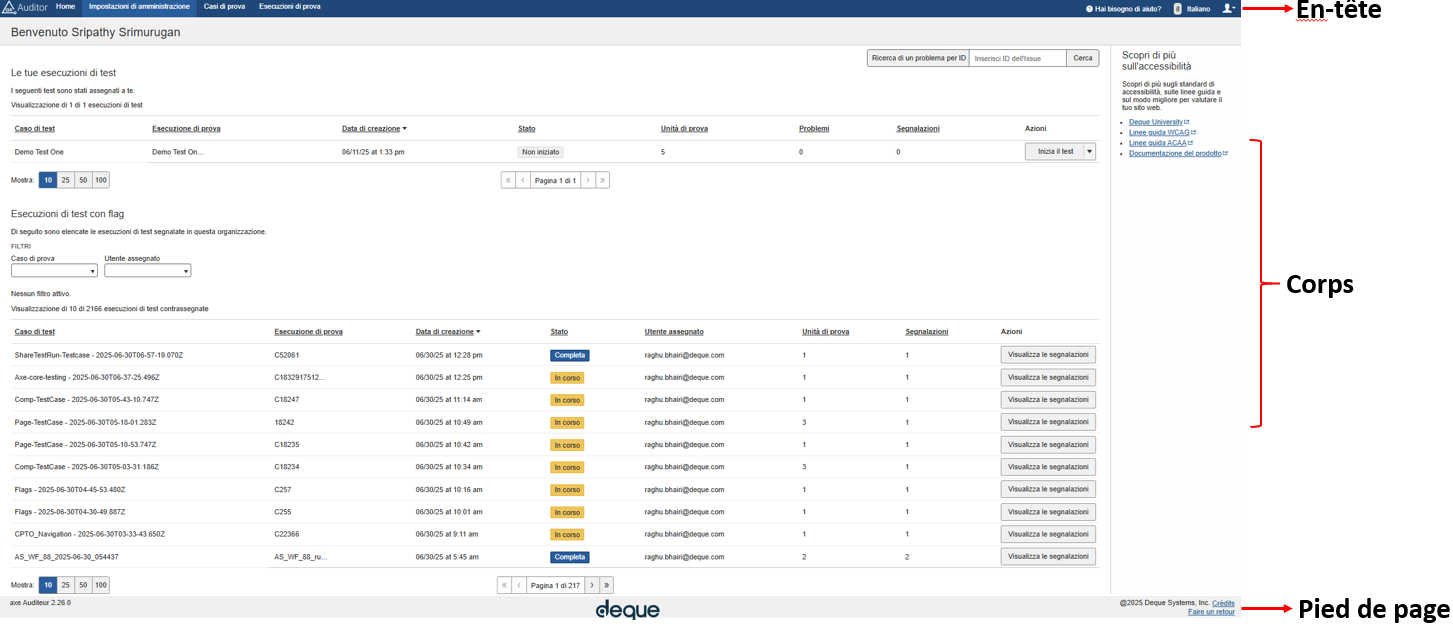 En général, l'interface utilisateur d'axe Auditor comprend des zones d'en-tête et de pied de page statiques en haut et en bas de chaque page et une zone de corps dynamique (contenu) au centre vertical. three regions Dans chacun d'eux, vous pouvez vous attendre à ce que les types de contenu et de fonctionnalités suivants soient présents.