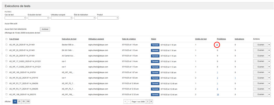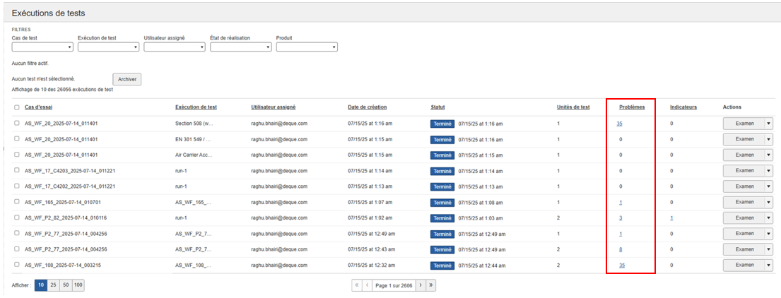À partir de l'écran Exécutions de tests, vous pouvez afficher les problèmes enregistrés en cliquant sur le lien dans la colonne Problèmes # .