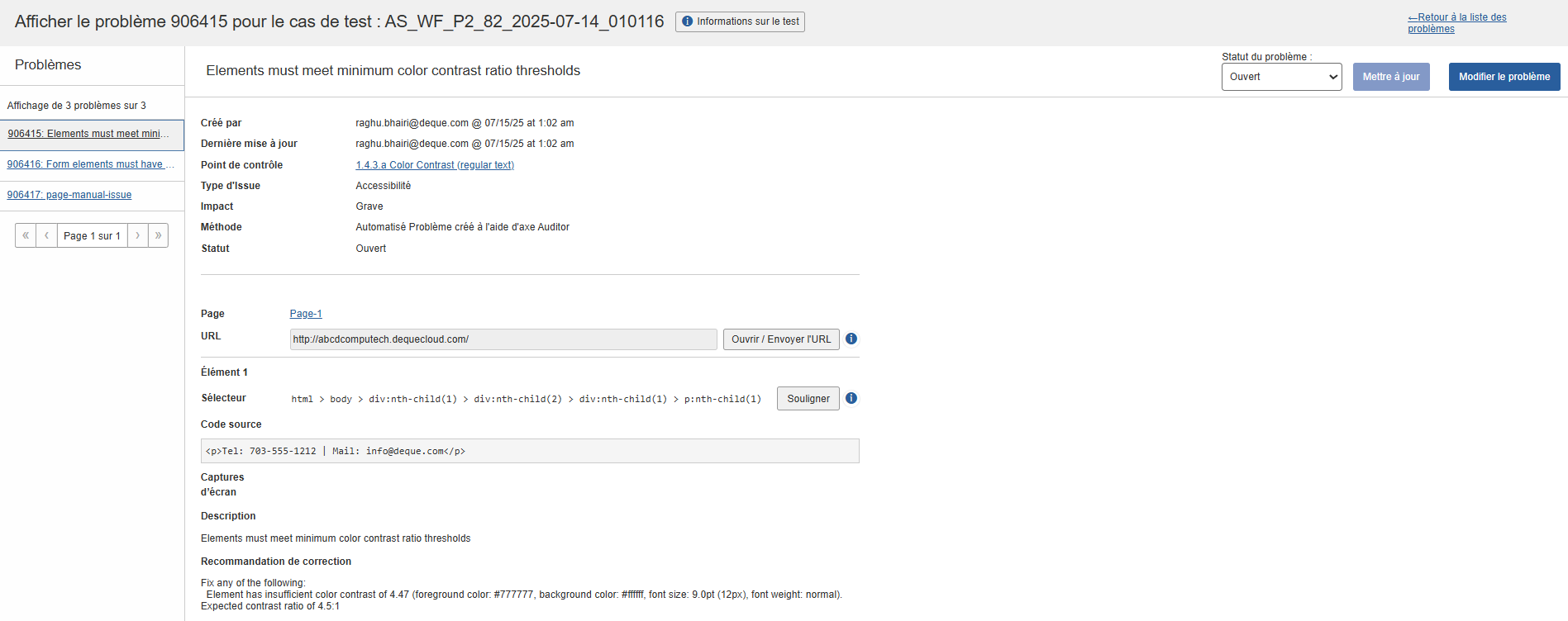 1. Sur l'écran Problèmes pour <Test Case Name> , cliquez sur le lien de l'ID du problème dans la colonne ID pour afficher tous les détails associés à un problème individuel sur l'écran de visualisation du problème (à partir duquel vous pouvez également cliquer sur un bouton pour modifier le problème). Lien vers la consultation des problèmes L'écran Afficher le problème <#> pour le cas de test : apparaît, affichant tous les détails associés au problème individuel enregistré, ainsi que des boutons pratiques qui vous permettent de modifier le problème, d'envoyer l'URL et de le mettre en surbrillance. Écran de consultation des problèmes