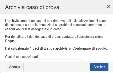 Caution: L'archiviazione dei casi di test rimuove i casi di test dalla visualizzazione, Compresi quelli assegnati o in corso di esecuzione. Questo Serve essenzialmente a cancellare i record dall'interfaccia utente dell'applicazione, rendendoli inaccessibili. Ripristino del caso di prova Il recupero dei dati è possibile solo contattando il Supporto Clienti Deque.