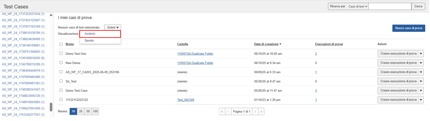 I casi di test vengono rimossi dalla vista nella pagina Casi di test. Un messaggio appare brevemente nell'angolo in alto a destra dello schermo per confermare il completamento corretto dell'operazione di archiviazione.