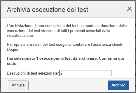 Attenzione: l'archiviazione di un'esecuzione di test comporta la rimozione dalla visualizzazione dei relativi problemi, che possono essere ripristinati solo contattando l'assistenza clienti Deque.