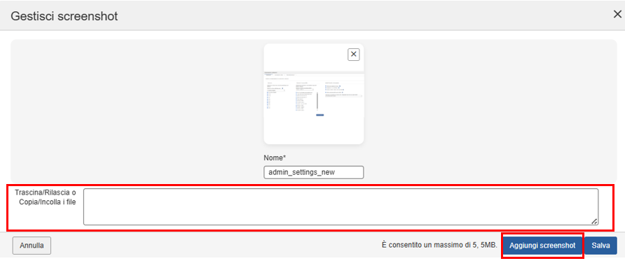 Utilizzare il pulsante Manage Screenshots per visualizzare la finestra di dialogo in cui è possibile copiare e incollare gli screenshot dagli appunti, trascinare e rilasciare oppure aggiungerli dal sistema in Auditor.
