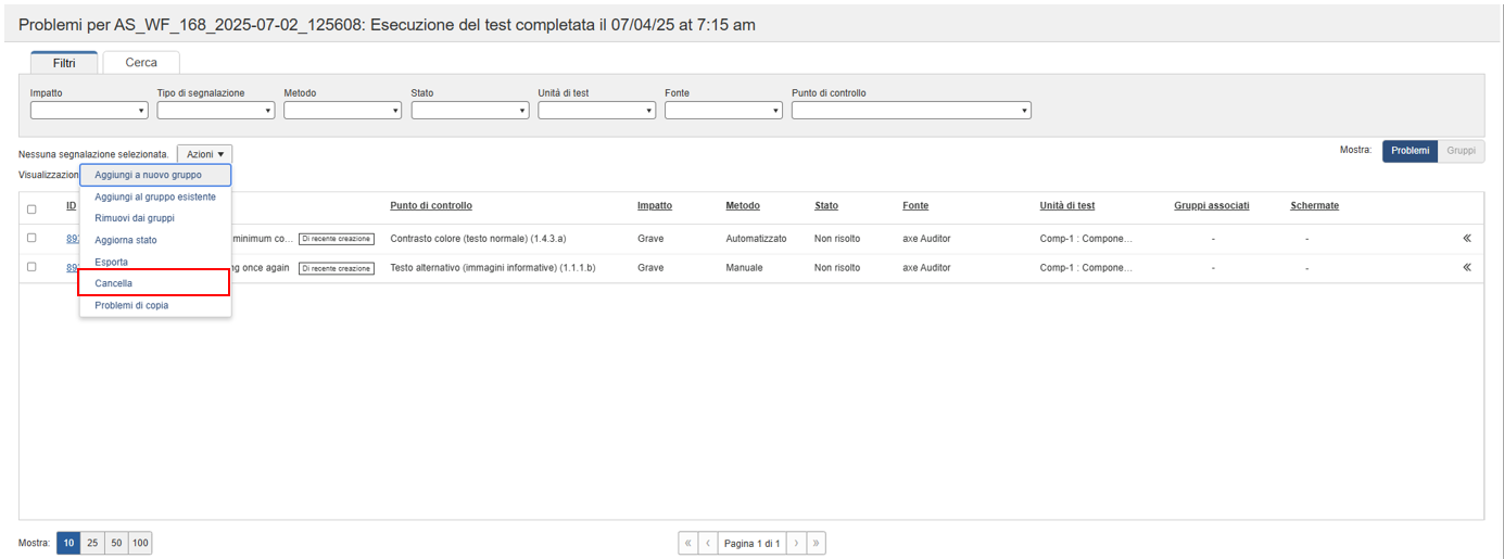 Per maggiore comodità, axe Auditor ti offre un'opzione nella schermata 'Problemi per...' che ti consente di selezionare due o più problemi precedentemente aggiunti ai Checkpoint come parte di un particolare Caso di Test e poi rimuoverli tutti con un "global" pulsante nella parte superiore della tabella.