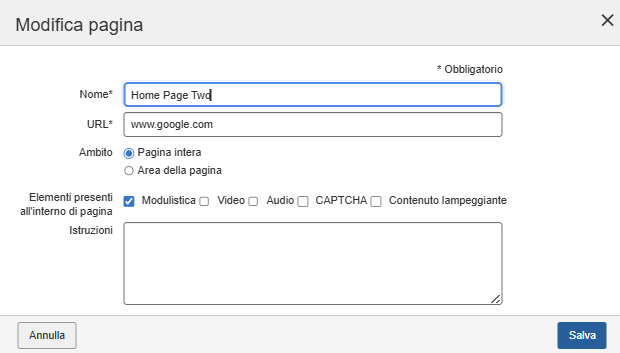 | Instructions | Digitare eventuali istruzioni testuali dettagliate che è importante che il tester comprenda prima di testare la pagina (ad esempio, informazioni specifiche richieste per accedere e/o esporre gli elementi della pagina da testare). Nota: quando è necessario uno spazio di campo più ampio, selezionare e trascinare l'angolo inferiore destro della casella di testo per espanderla verso l'esterno. |