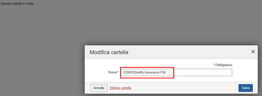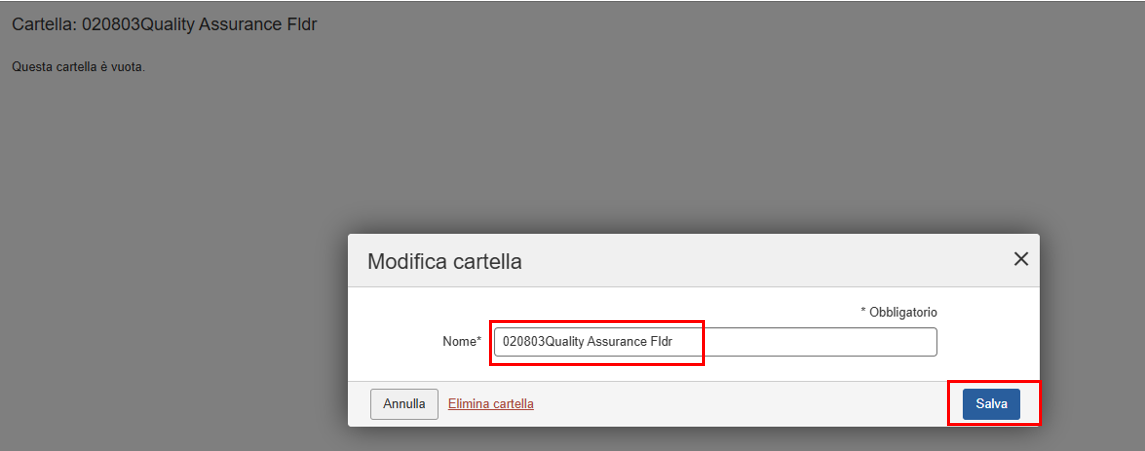 Dopo aver selezionato il nome della cartella dal menu della barra laterale sinistra, fare clic sul pulsante Modifica cartella per modificare il nome della cartella o eliminarla. Per ulteriori informazioni, vedere Modifica di una cartella.