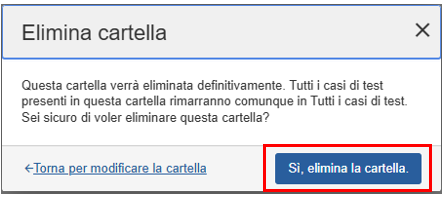 L'azione Elimina per una cartella sposta tutti i suoi casi di test nel filtro 'Tutti i casi di test' . In altre parole, elimina la cartella, ma non i casi di test in essa contenuti. Se si desidera archiviare ogni caso di test all'interno di una cartella che si desidera eliminare, fare riferimento a Archiviazione di un caso di test.