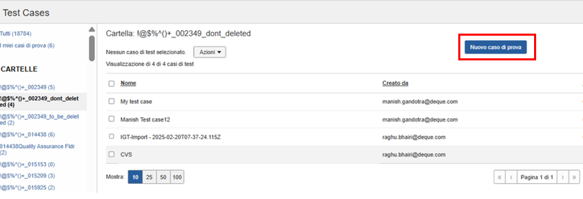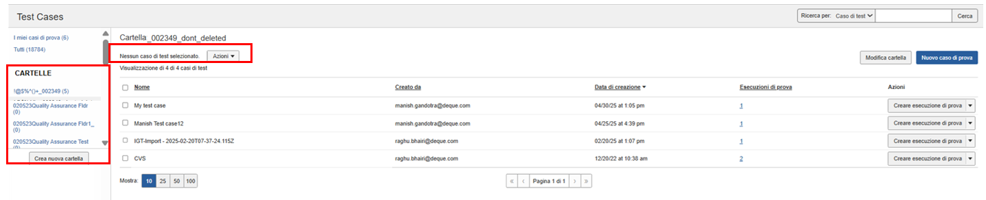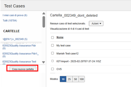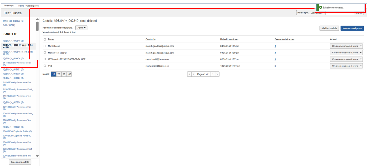 Un messaggio appare brevemente in alto a destra della schermata Casi di test per indicare la creazione riuscita e la cartella creata appare nel menu della barra laterale sinistra.