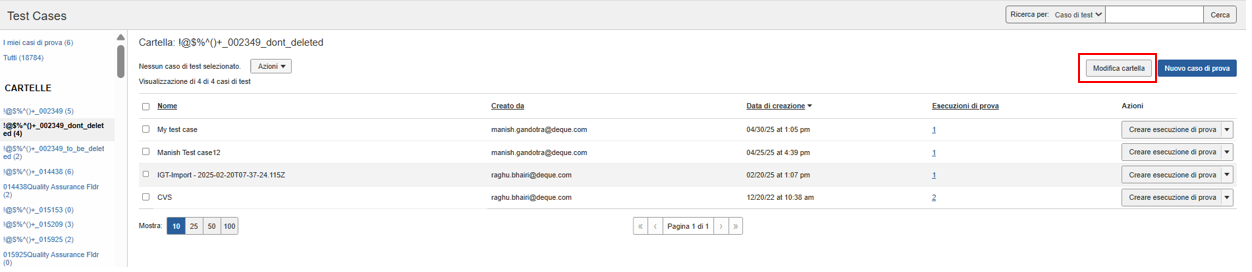 Nel riquadro della barra laterale sinistra della schermata Casi di test, fare clic sul pulsante folder name, quindi nel riquadro destro, a destra del nome della cartella, fare clic sul pulsante Edit folder .