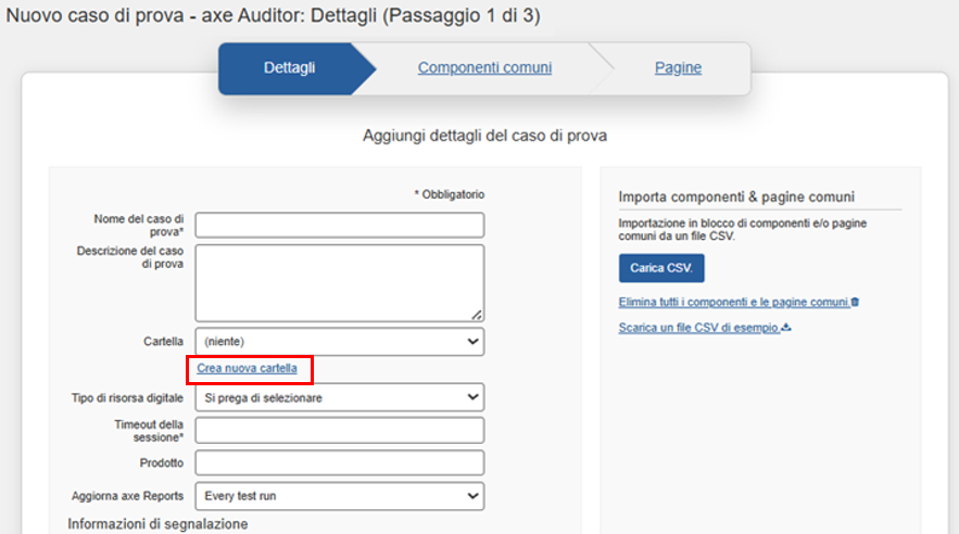 È anche possibile creare una nuova cartella quando, dopo aver avviato il processo di creazione di un nuovo caso di test, ci si rende conto che non esiste ancora una cartella con il nome appropriato.