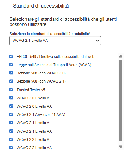 - Selezionare lo standard dal menu a discesa. Lo standard predefinito è WCAG 2.1 Livello AA.