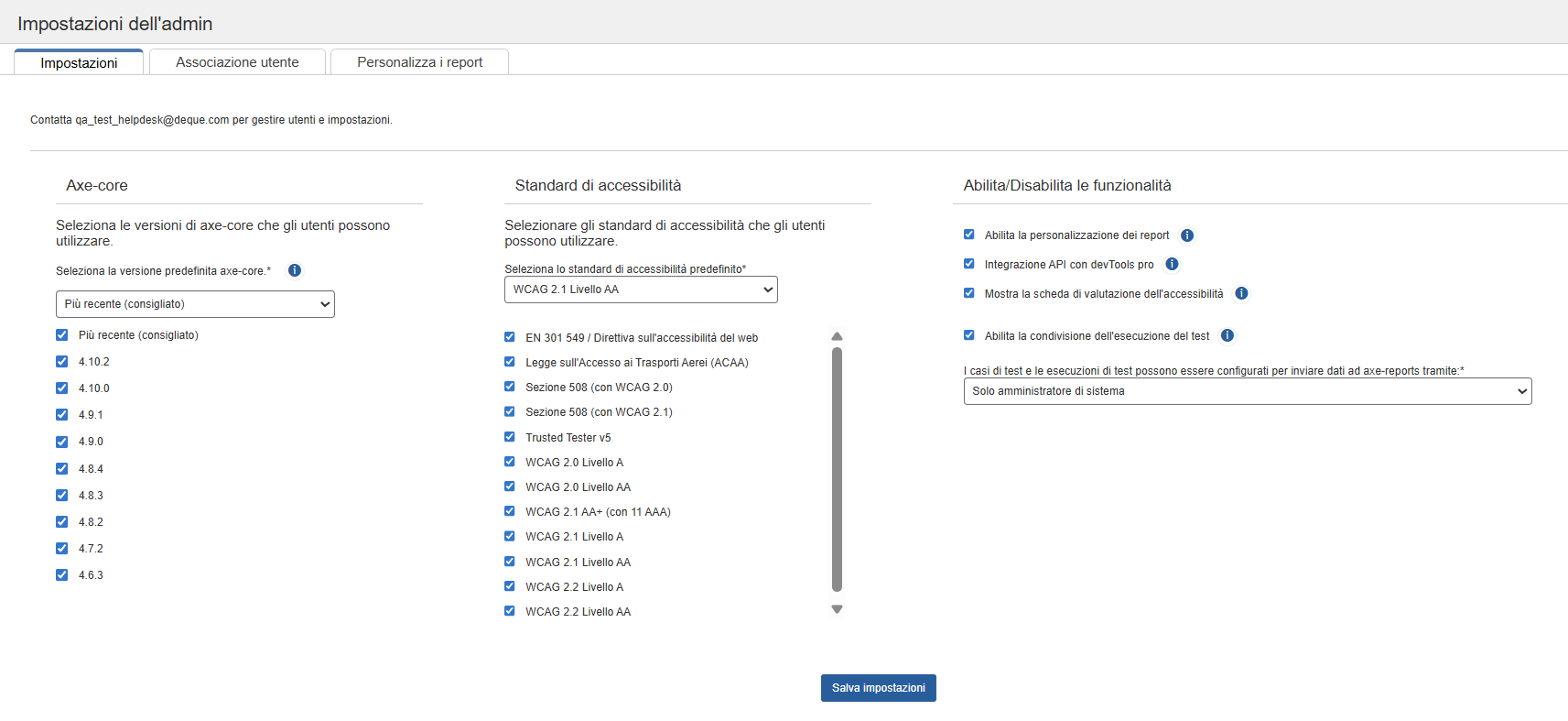 La schermata Impostazioni amministratore viene utilizzata dagli amministratori di sistema per gestire la versione del core di axe, gli standard di accessibilità disponibili per la selezione nelle esecuzioni di test e per abilitare o disabilitare le impostazioni di condivisione pubblica per la propria organizzazione. Gli amministratori possono abilitare più versioni del core di axe per i propri utenti, in modo da poter testare le esecuzioni dei test con diversi set di regole forniti dal core di axe per verificare, convalidare e confrontare i problemi segnalati o risolti.