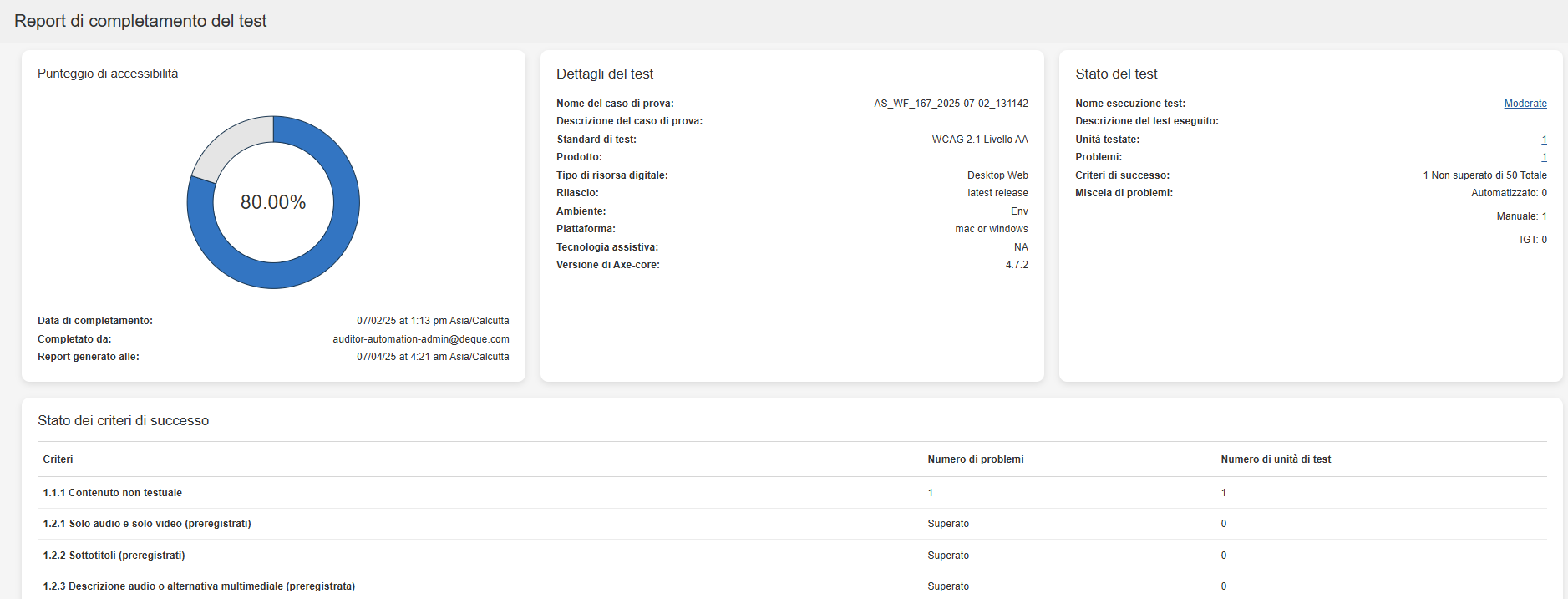 - Accessibility Score: Il punteggio di accessibilità è una metrica utilizzata per valutare la conformità di un'esecuzione di test agli standard, alle linee guida e alle best practice in materia di accessibilità. Il punteggio di accessibilità viene calcolato in percentuale: una percentuale più alta indica un rischio minore di problemi di accessibilità.