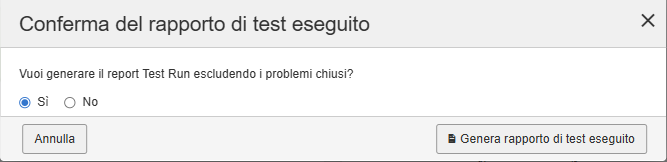 Generate Test Run Report button: Utilizzare il pulsante per visualizzare e stampare un report HTML per le esecuzioni dei test completate. Facendo clic sul pulsante Generate Test Run Report viene visualizzata una finestra di dialogo di conferma in cui è possibile decidere se generare il report con o senza problemi chiusi.