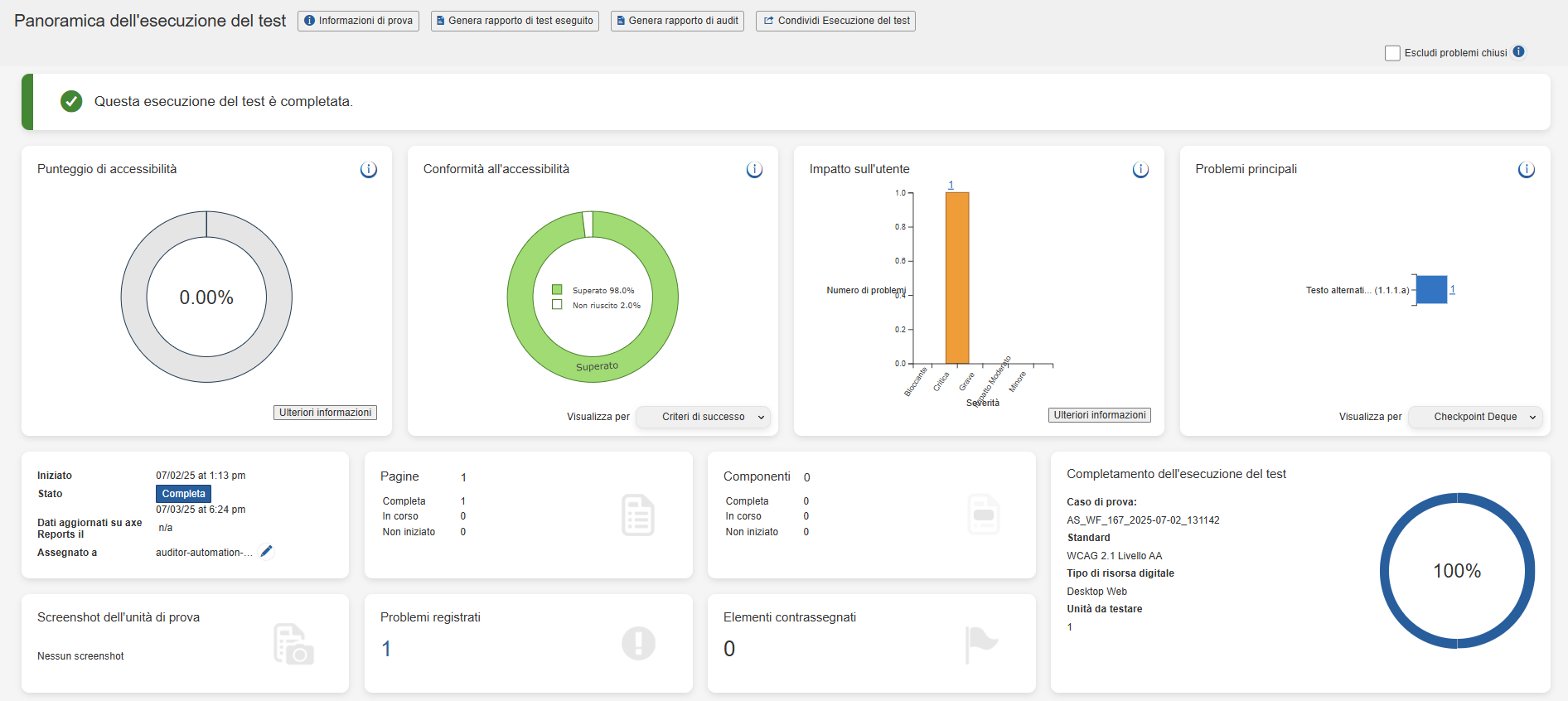 Note: Il pulsante Generate Test Run Report viene visualizzato nella pagina Panoramica esecuzione test solo quando gli standard di test selezionati sono WCAG, EN o Trusted Tester.