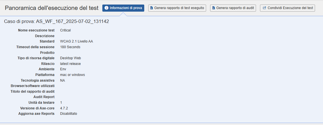 Test Info button: espande una utile sezione di riferimento delle informazioni sottostanti che mostra dettagli aggiuntivi su questa esecuzione del test, come Descrizione, Standard, Sessione, timeout, Prodotto, Versione, Ambiente, Piattaforma, Tecnologia assistiva e Unità da testare.
