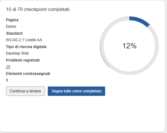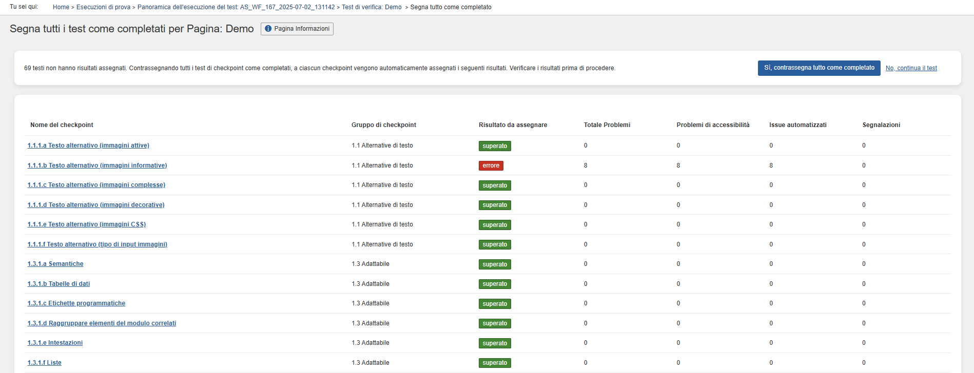 Cliccando sul link "Segna tutto completato" in alto a destra della schermata Test di checkpoint per pagina