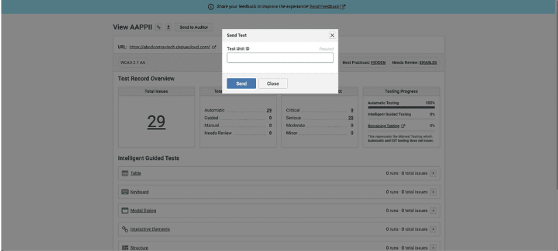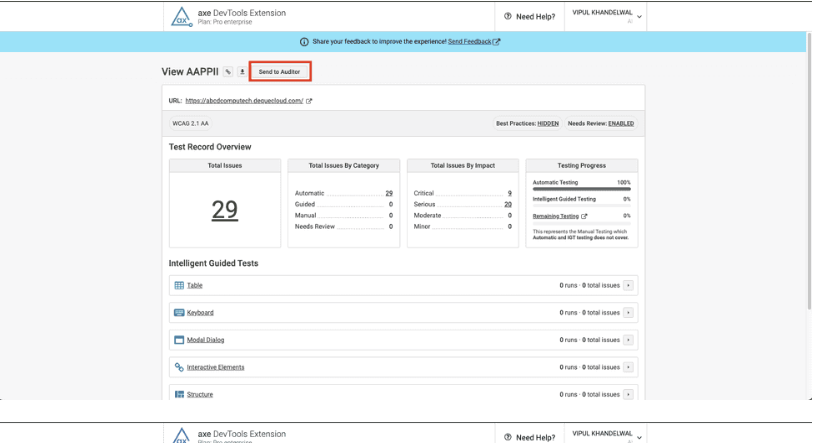 Ora gli utenti possono inviare Automated, IGT, and Manual issues direttamente ad Auditor tramite integrazione. Inoltre, screenshots will be included con i problemi importati per un contesto migliore. Tutti validations, inclusi URL checks, testing methodology standards, and axe-core version compatibility, si applicheranno anche ai dati importati, garantendo accuratezza e coerenza.