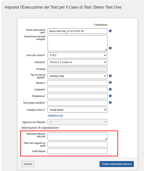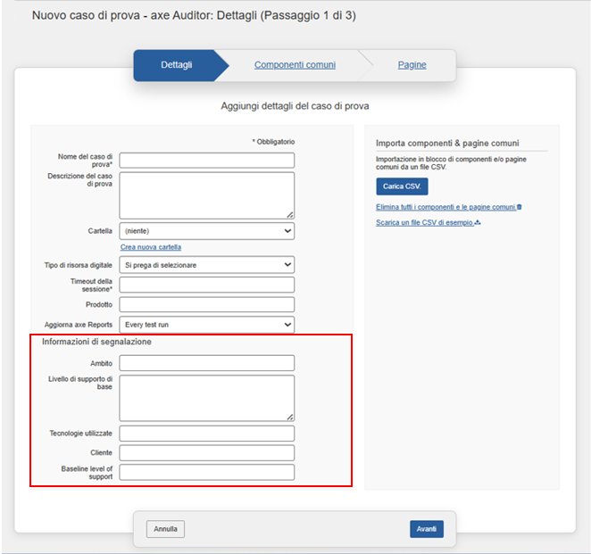 Una nuova sezione è stata aggiunta alle e pagine. Reporting Information Add Test Case Details Create Test Runs Con questa opzione, gli utenti possono ora includere dettagli quali la metodologia di valutazione utilizzata, i domini, il supporto di accessibilità di base e la tecnologia utilizzata dal sito web o dall'applicazione durante l'aggiunta di dettagli sui casi di prova.