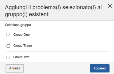 L' Add to Existing Group opzione nella sezione Issues è stata migliorata aggiungendo una casella di controllo ai nomi dei gruppi esistenti. Ora gli utenti possono selezionare il nome del gruppo spuntando la casella appropriata per aggiungere i problemi.