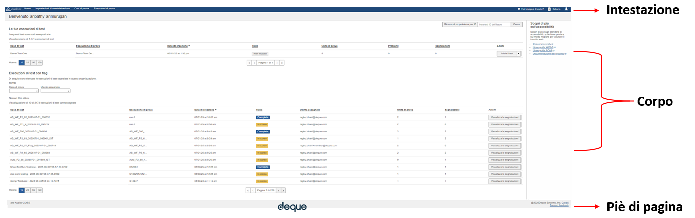 In genere, l'interfaccia utente di axe Auditor include aree di intestazione e piè di pagina statiche nella parte superiore e inferiore di ogni pagina e un'area dinamica del corpo (contenuto) nella parte centrale verticale. three regions In ognuno di essi puoi aspettarti la presenza dei seguenti tipi di contenuti e funzionalità.