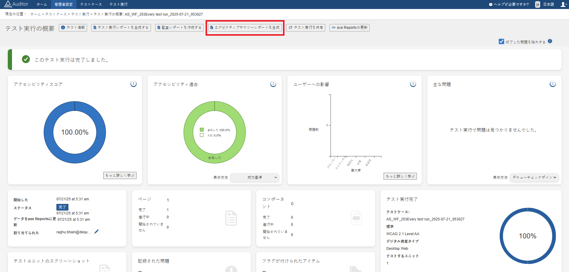 Genere un informe de resumen ejecutivo de alto nivel desde la página Descripción general de ejecución de pruebas (cuando lo habilitan los administradores). Este informe está diseñado para líderes y partes interesadas que necesitan información sobre accesibilidad sin detalles técnicos.