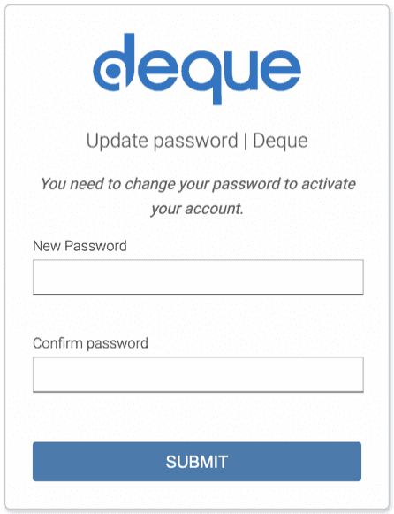 Wanneer de systeembeheerder binnen uw organisatie (of in veel gevallen door Deque admin.-personeel) een nieuw account voor u heeft aangemaakt om axe Auditor te gebruiken, wordt uw account aangemaakt met een gebruikersnaam en wachtwoord. Wanneer u zich echter voor het eerst met deze gegevens aanmeldt, kan het zijn dat u uw wachtwoord opnieuw moet instellen of een andere actie moet uitvoeren. Dit is ter beoordeling van de beheerder.