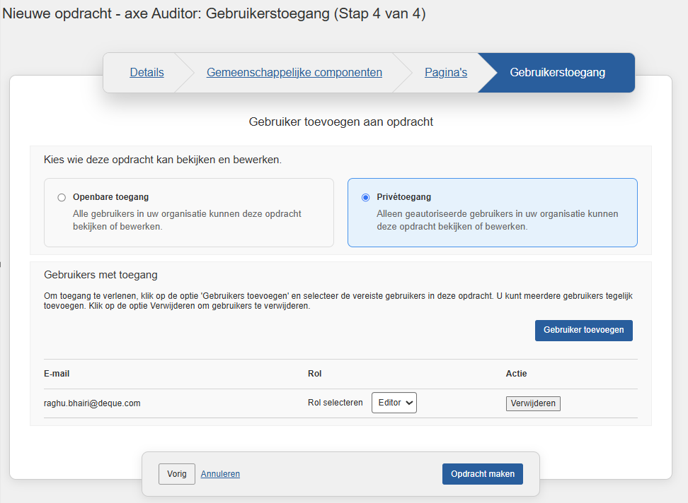- Klik op Privétoegang. De sectie Gebruikers toevoegen aan testcase wordt weergegeven.
