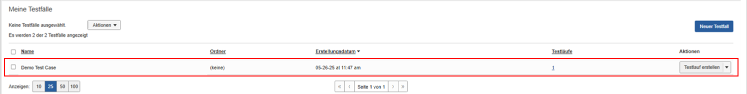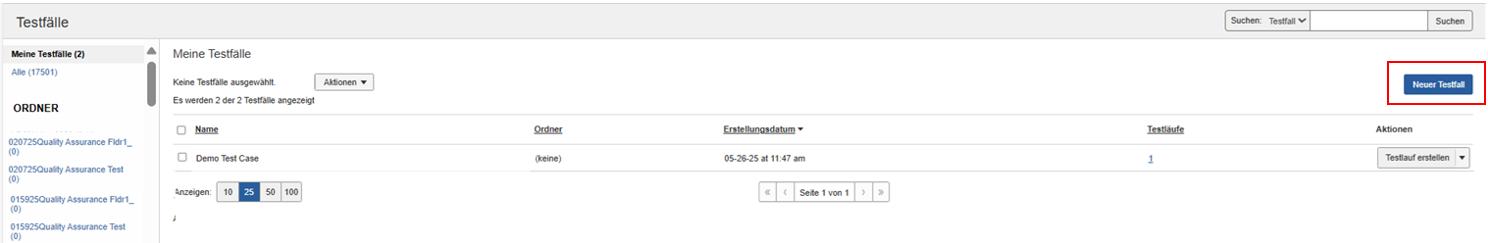 De nieuwe testcase die u hebt gemaakt, verschijnt op het scherm Testcases in de Map die u hebt opgegeven (of in Ongeorganiseerd, indien niet opgegeven), weergevend De naam en productinformatie die u hebt ingevoerd.
