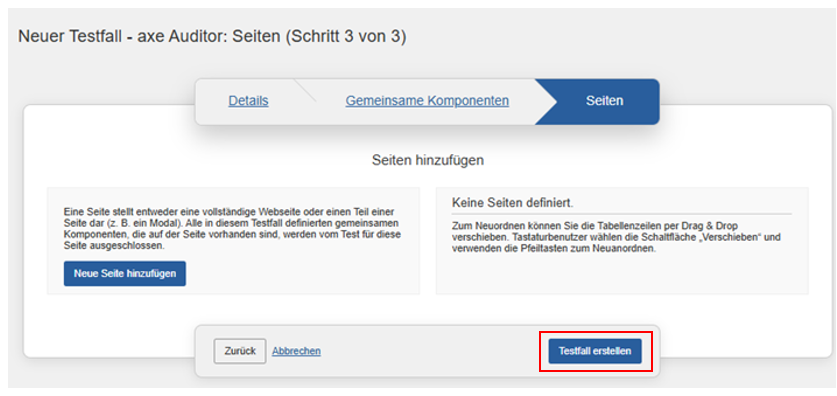 Nadat u de gegevens hebt opgegeven, activeert u de knop Testcase maken rechtsonder in het paneel Pagina's.