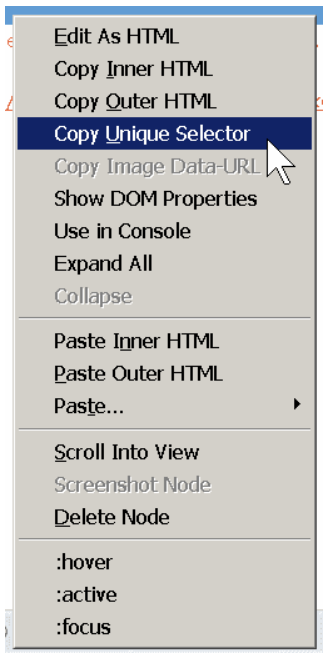 Kopieer de CSS-selector waarop u wilt targeten. Wanneer u bijvoorbeeld Firefox Developer Tools gebruikt, kunt u met de rechtermuisknop klikken > Unieke selector kopiëren voor het op dat moment geselecteerde element in de Inspector-tool. Zorg ervoor dat u de volledige elementreferentie met de juiste opmaak plakt (om bijvoorbeeld het kenmerk-element