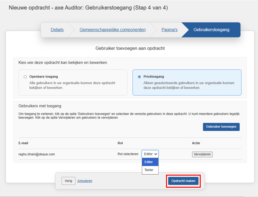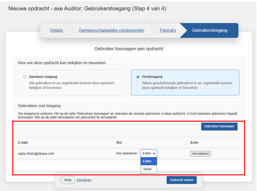 Om de bestaande gebruikerstoegang te bewerken, wijzig in de sectie Gebruiker toevoegen de gebruikersrechten voor het geselecteerde testgeval. De beschikbare toegangs¬niveaus zijn: