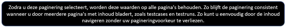 Zodra u deze paginering selecteert, worden deze waarden op alle pagina's behouden. Zo blijft de paginering consistent wanneer u door meerdere pagina's met inhoud bladert, zoals testcases en testruns. Zo kunt u eenvoudig door de inhoud navigeren zonder uw pagineringvoorkeur te verliezen.
