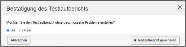 • Generate Test Run Report button: Gebruik de knop om een HTML-rapport van voltooide testruns te bekijken en af te drukken. Wanneer u op de knop Generate Test Run Report klikt, wordt er een bevestigingsdialoogvenster geopend waarin u kunt aangeven of u het rapport met of zonder gesloten problemen wilt genereren.