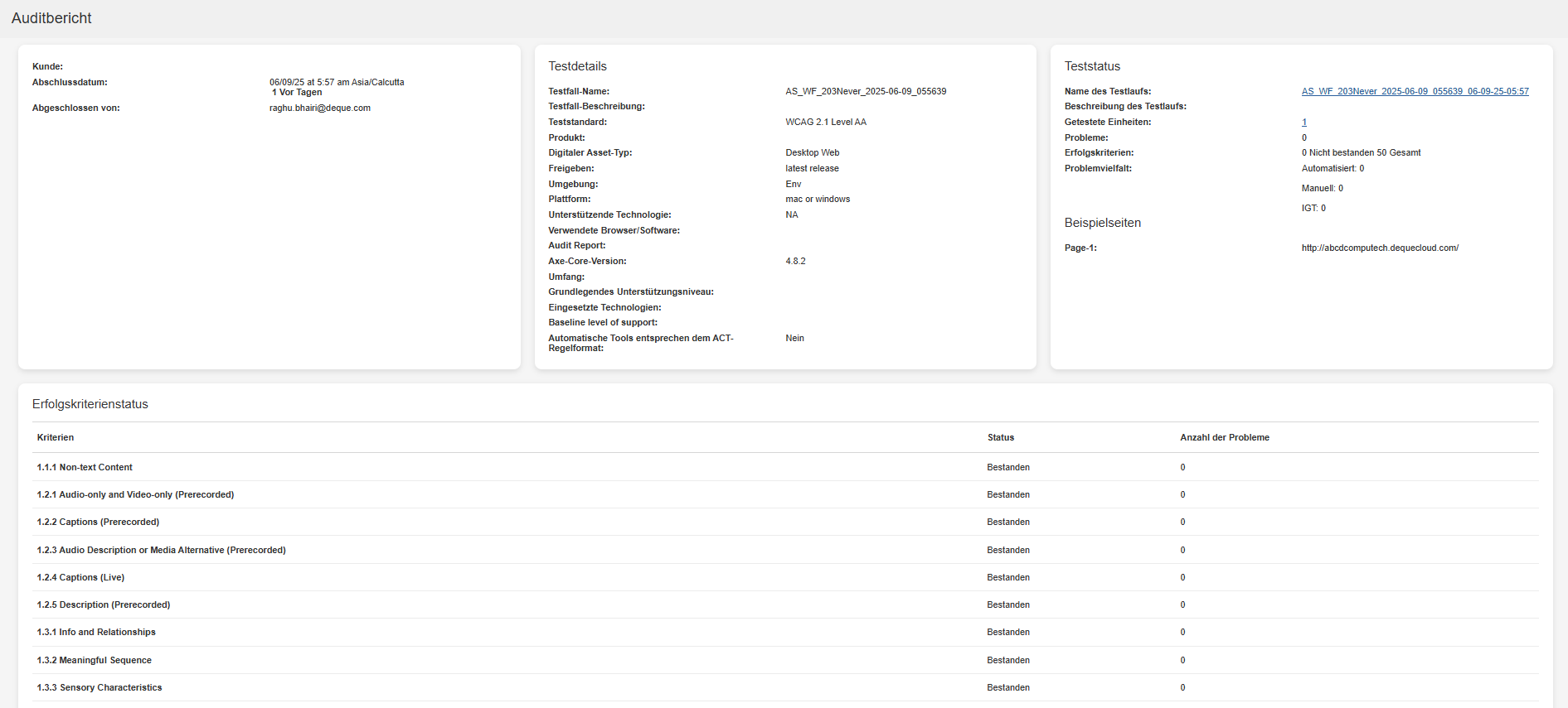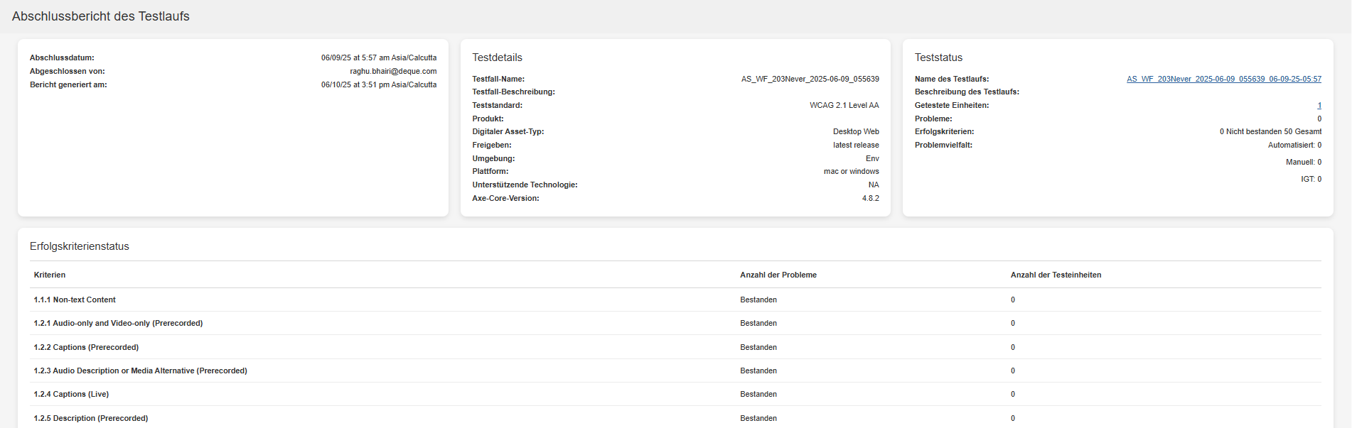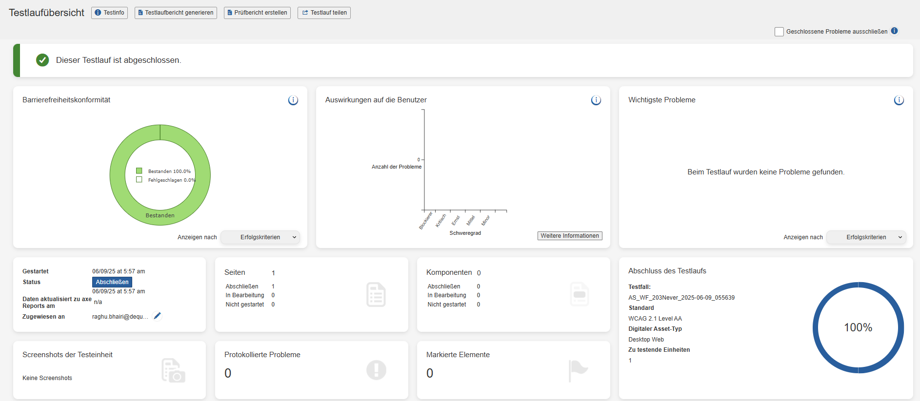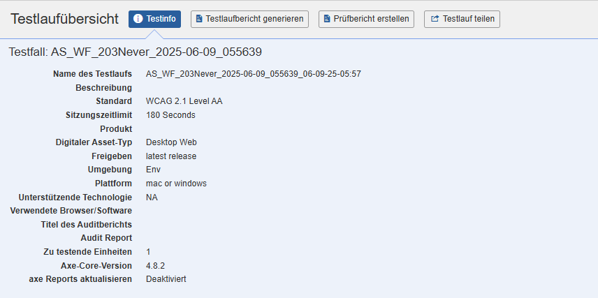 Note: De knop Generate Test Run Report wordt alleen weergegeven op de pagina Test Run Overview als de geselecteerde testnormen WCAG, EN of Trusted Tester zijn.