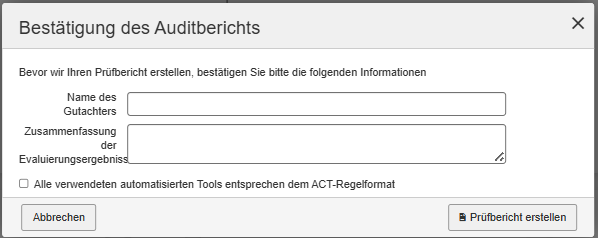 • Generate Audit Report: Gebruik deze optie om het auditrapport te genereren nadat de testrun is voltooid. Als u op de optie Generate Audit Report klikt, wordt het Audit Report Confirmation dialoogvenster weergegeven waarin u de naam van de evaluator kunt invoeren en het All automated tools used comply with the ACT rule format selectievakje kunt aanvinken.