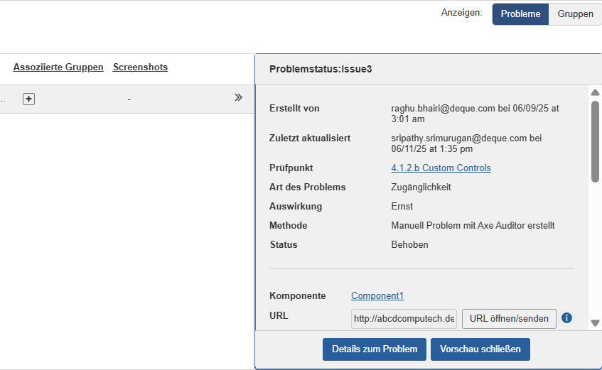 Issue Preview kolom: Activeer de << arrow knop om een voorvertoning van enkele details van het probleem te bekijken. Activeer de Probleemdetails om de pagina Probleemdetails te openen. Om het voorbeeld te sluiten, activeert u de knop Close Preview .