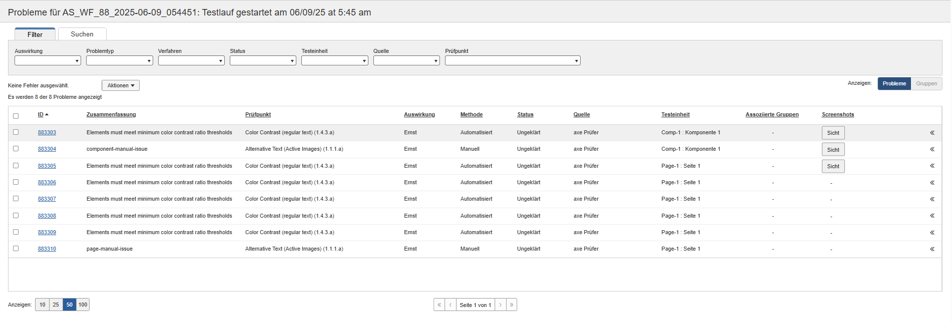 Het scherm 'Problemen voor <Test Case Name> ' toont een tabel met probleeminformatie voor de geselecteerde testcase, met filters waarmee u kunt verfijnen welke problemen worden weergegeven op basis van verschillende criteria. Bovendien kunt u via dit scherm problemen filteren en exporteren.