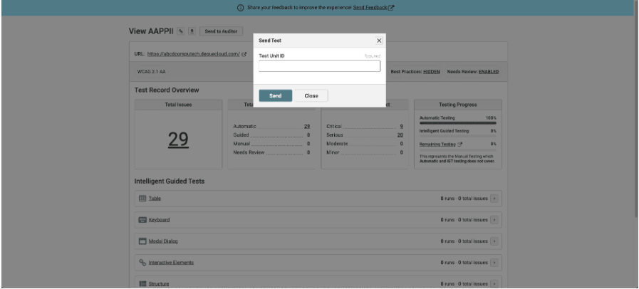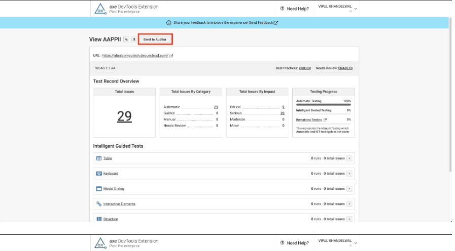 Gebruikers kunnen nu sturen Automated, IGT, and Manual issues rechtstreeks naar Auditor via integratie. Bovendien kunnen gebruikers de geïmporteerde problemen gebruiken voor een betere context. screenshots will be included Alles, inclusief de genoemde items, wordt ook toegepast op geïmporteerde gegevens, wat nauwkeurigheid en consistentie garandeert. validations URL checks, testing methodology standards, and axe-core version compatibility