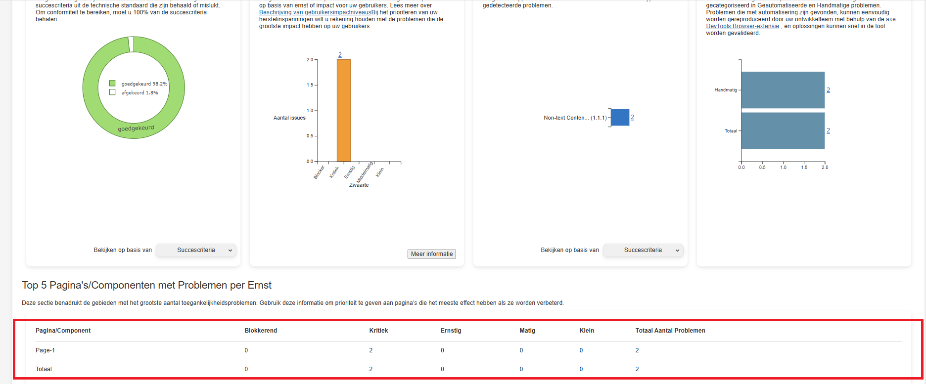 - Geeft een overzicht van de 5 meest getroffen pagina's of componenten, geprioriteerd op basis van de ernst van het probleem (Blokkerend → Klein).