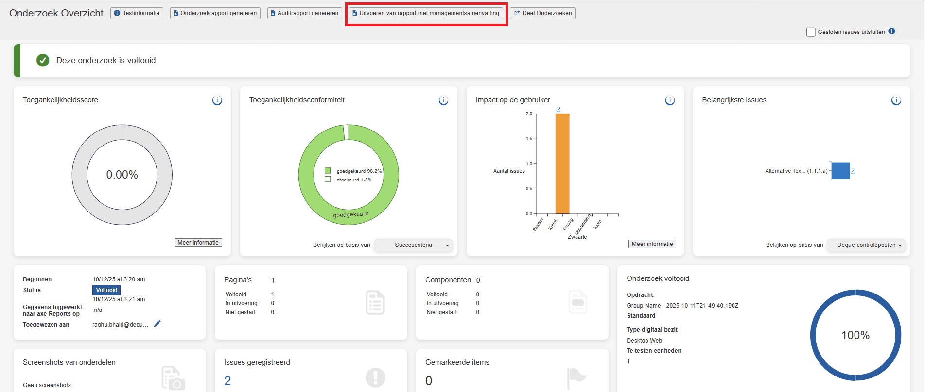 Genereer een uitvoerend samenvattingsrapport vanaf de pagina Test Run Overview (indien ingeschakeld door beheerders). Dit rapport is bedoeld voor leidinggevenden en belanghebbenden die inzicht nodig hebben in toegankelijkheid zonder technische details.
