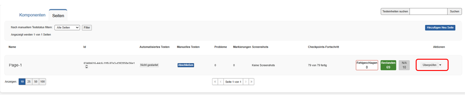 Note: De knop Testen starten wordt alleen weergegeven in de kolom Acties wanneer in de kolom Status de status 'Niet gestart' wordt weergegeven. Meestal is dit een nieuwe testrun die is gemaakt en toegewezen aan een gebruiker, maar waarvan de tests nog niet zijn gestart voor de afzonderlijke componenten of pagina's die moeten worden getest.
