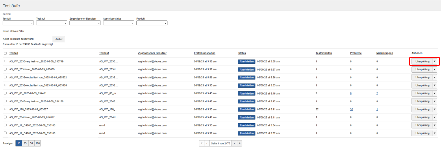 Zie Overzicht test-run voor meer informatie over de beschikbare informatie en actie-opties op de pagina Overzicht test-run.