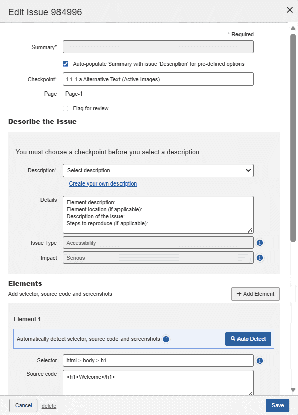 Make changes to the fields by editing text entries, changing selections and/or uploading/deleting screenshots. You can also use the Auto Detect feature to automatically add elements for manual issues.