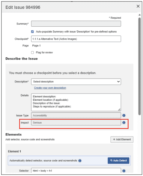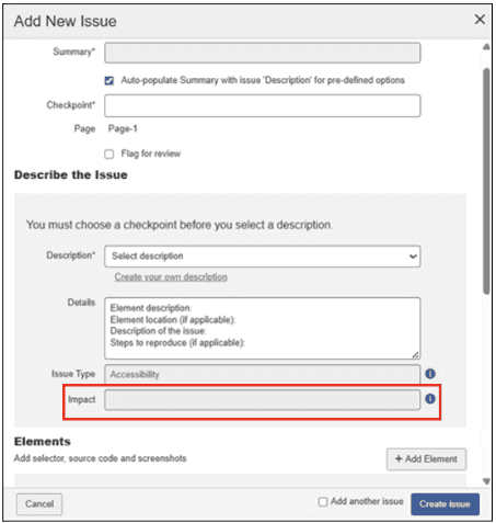 - Exception: If a user chooses to add a custom issue description, the Impact field will automatically become enabled so they can assign the appropriate severity for the custom issue.