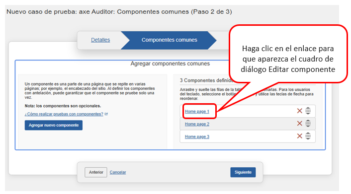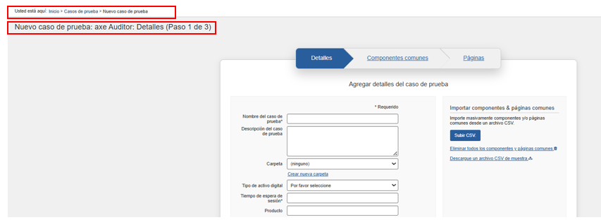 • To edit the details, tenga en cuenta que el botón Siguiente en la parte inferior del panel, o los enlaces de pestañas para Componentes comunes o Páginas le permiten navegar fuera del panel después de realizar ediciones, y si regresa al panel Detalles, esas ediciones permanecerán. Sin embargo, debe navegar al panel Páginas y hacer clic en el botón Guardar caso de prueba para que esas modificaciones surtan efecto. Para obtener más información sobre cómo editar los campos en el panel Detalles, consulte Agregar detalles del caso de prueba.